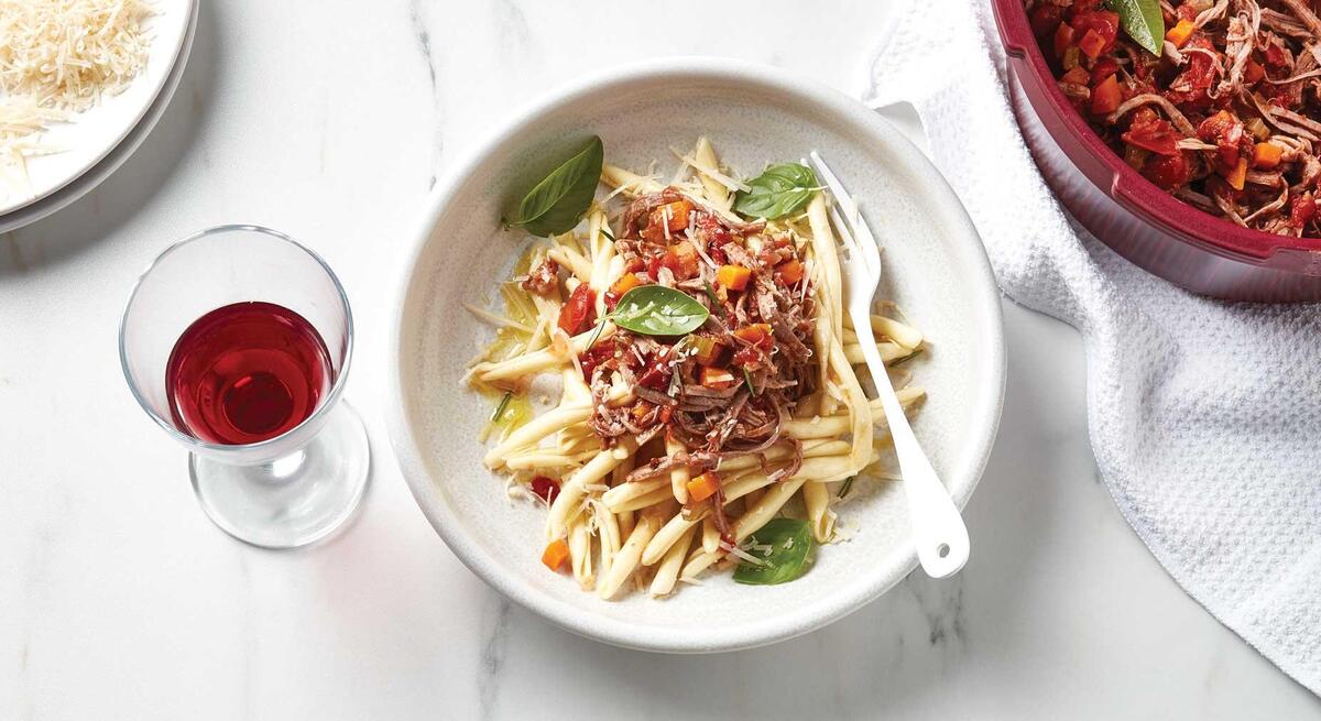 4. Послужете го рагу со варени тестенини, свеж босилек, пармезан и наросете маслиново масло.